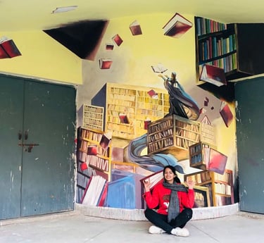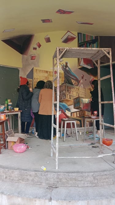 I contributed significantly to the design and painting process, working with large-scale surfaces and applying my skills in composition, oil and acrylic techniques, and collaborative planning. The mural symbolized creativity, knowledge, and cultural identity, transforming the university library into a vibrant artistic landmark.